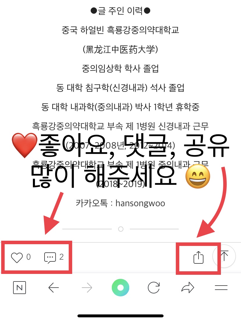 ●글 주인 이력● 중국 하얼빈 흑룡강중의약대학교 黑龙江中医药大学 중의임상학 학사 졸 동 대학 침구학 석사 졸 동 대학 내과학 박사 1학년 중 휴학 흑룡강중의약대학교 부속 제 1병원 1 신경내과 근무 카카오톡..