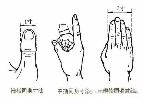 - 중의학에선 "同身寸"이라는 말이 있습니다. 취혈 시 자주 사용하는 "촌寸"이라는 단위는 본인의 엄지손가락을 이용하여 혈자리의 거리를 가늠하는 척도를 말합니다. 중지를 접은 상태에서 1, 2관절 사이의 거리가 1촌이며, 엄지손가락 관절의 횡단 거리도 1촌입니다. 또한 엄지손가락을 제외한 나머지 네 손가락을 바르게 모아 편 상태에서 중지의 2번째 관절을 기준으로 검지 끝과 약지 끝의 거리는 3촌입니다.