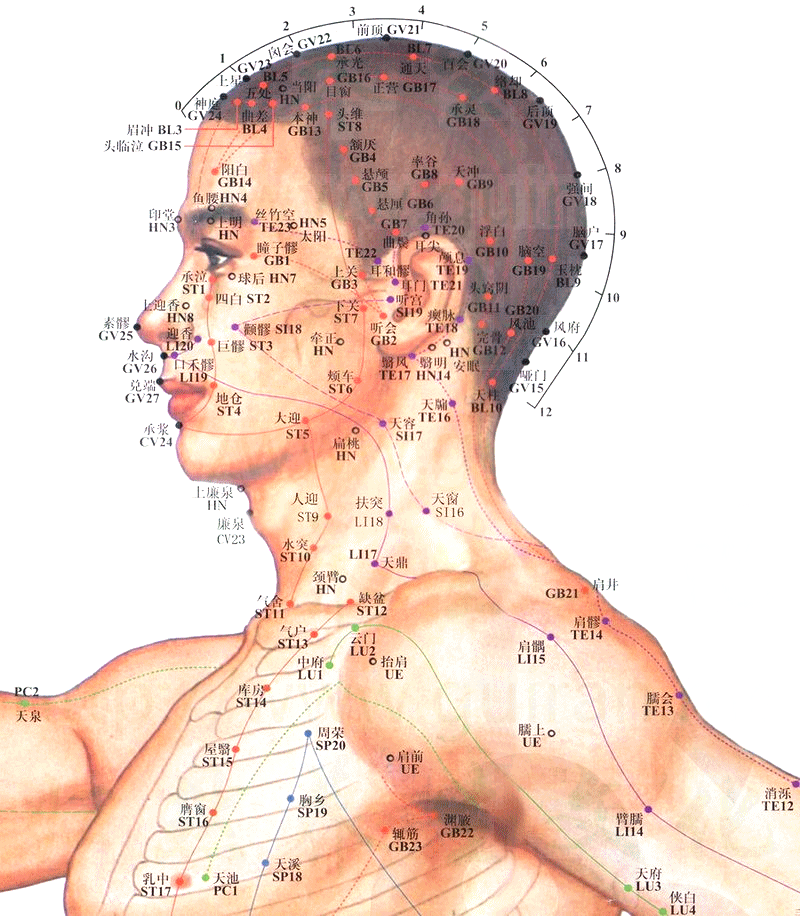 12경맥, 수삼양경의 하나인 수양명대장경은 수태음폐경과 서로 표리관계입니다. 위로 식지에서 수태음폐경과 접하고 아래로는 족양명위경과 코 옆에서 만납니다. 식지 → 위팔 바깥 쪽의 앞 → 어깨 앞쪽 → 목 → 뺨 → 코 옆으로 분포되어 있습니다(아래 이미지 참조). 상양혈을 시작으로 영향혈에서 끝나고 좌우 각 20개혈로 총 40개입니다.