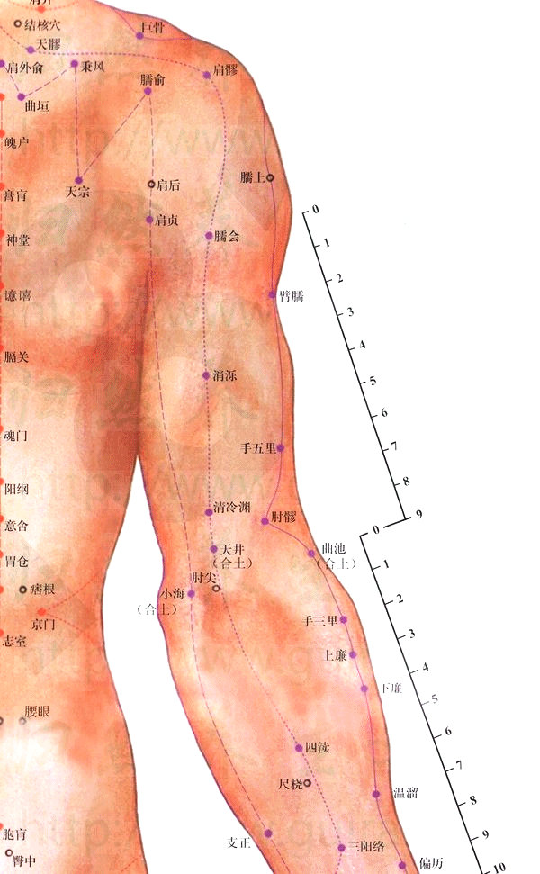 - 위치 : 상박의 외측, 팔을 구부렸을 때 팔꿈치머리 직상 방향으로 1촌 떨어진 오목한 곳.