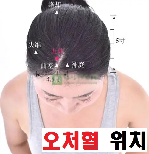 오처혈은 머리 부분, 이마의 위쪽, 이마 정중앙선에서 앞머리카락 시작점 위로 1촌 떨어진 곳에서 다시 좌우로 1.5촌 떨어진 곳에 위치하고 있습니다. 어제 포스팅한 곡차혈의 직상 방향에 있습니다.
