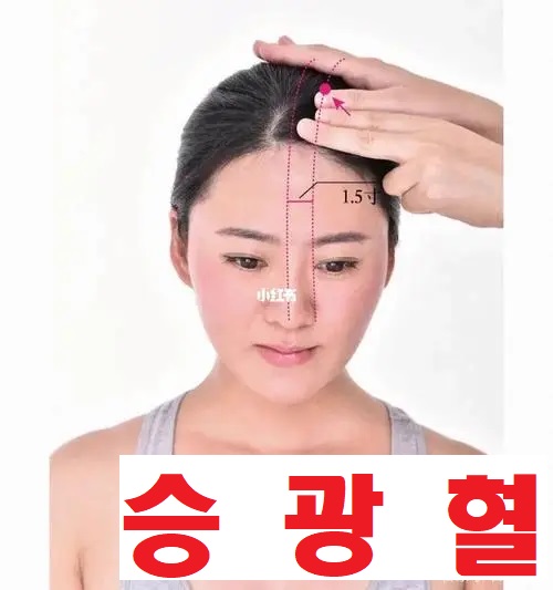 승광혈은 머리 부분, 이마의 정중선 앞머리카락 시작점 위로 2.5촌 떨어진 곳에서 다시 좌우로 1.5촌 떨어진 곳에 위치하고 있습니다. 위에 있는 이미지와 아래 있는 이미지를 잘 살펴보셔서 찾아보시기 바랍니다.