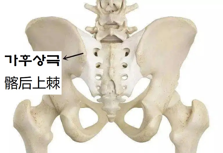 위 이미지에서의 상료혈 찾는 방법은 인체 후면 정중앙선(척추)의 제 1저골극돌에서 수평선을 그어 만나는 가후상극의 중간지점으로 찾는 방법입니다.