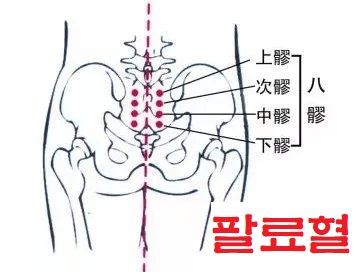 팔료혈은 상, 차, 중, 하료혈 4가지로 좌우 합쳐 총 8개의 혈자리로 팔료혈로 불린답니다.