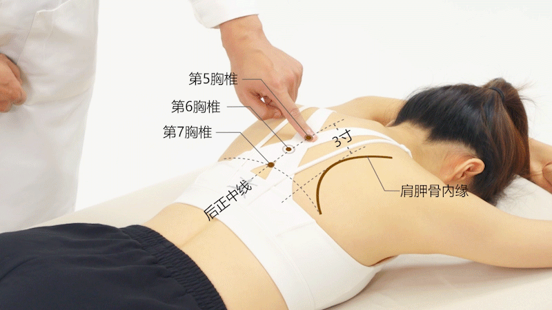 제 5번 흉추극돌의 아래 오목한 곳에서 우측으로 3촌 떨어진 곳으로 잡는 방법입니다.