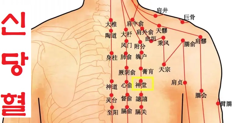 신당혈은 등 부분, 제 5번 흉추극돌의 아래 오목한 곳에서 다시 좌우로 3촌 떨어진 곳에 위치하고 있습니다. 좌우 합쳐 총 2개의 혈자리로 구성되어 있습니다.